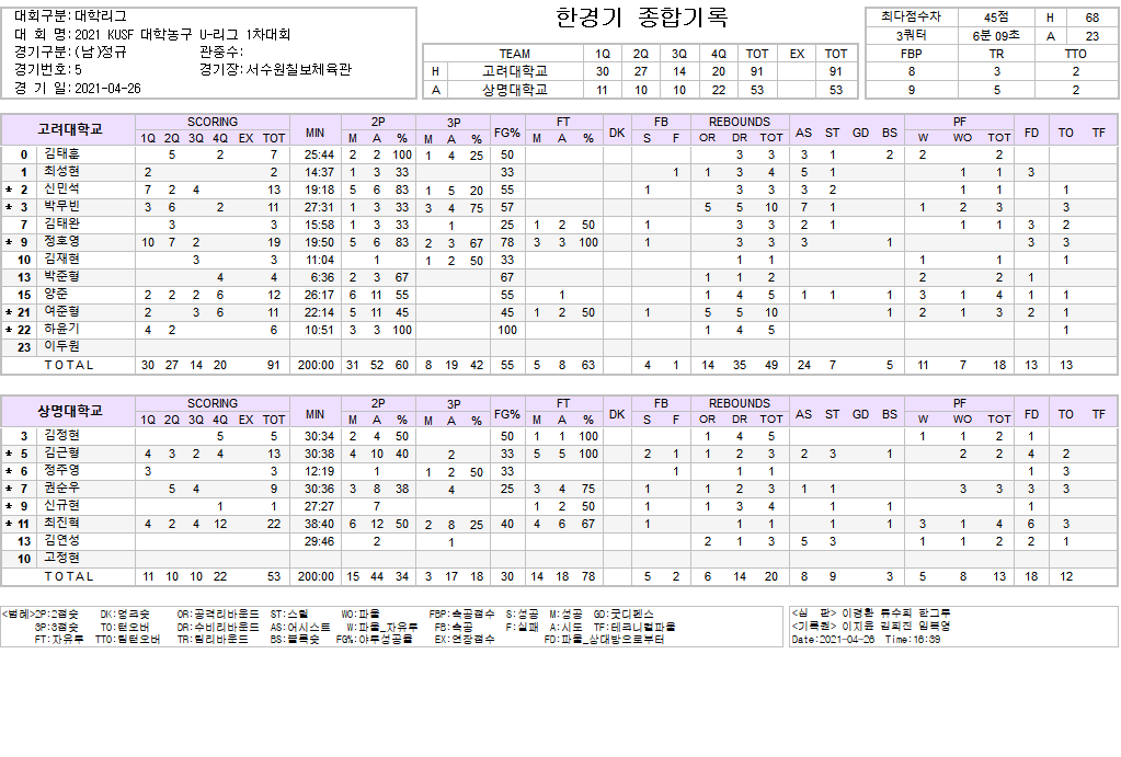 | [대학리그] 2021.4.28. 고려대 vs 동국대 (94:80 승) 기록지 및 다시 보기 (0) | 2021.05.07 |