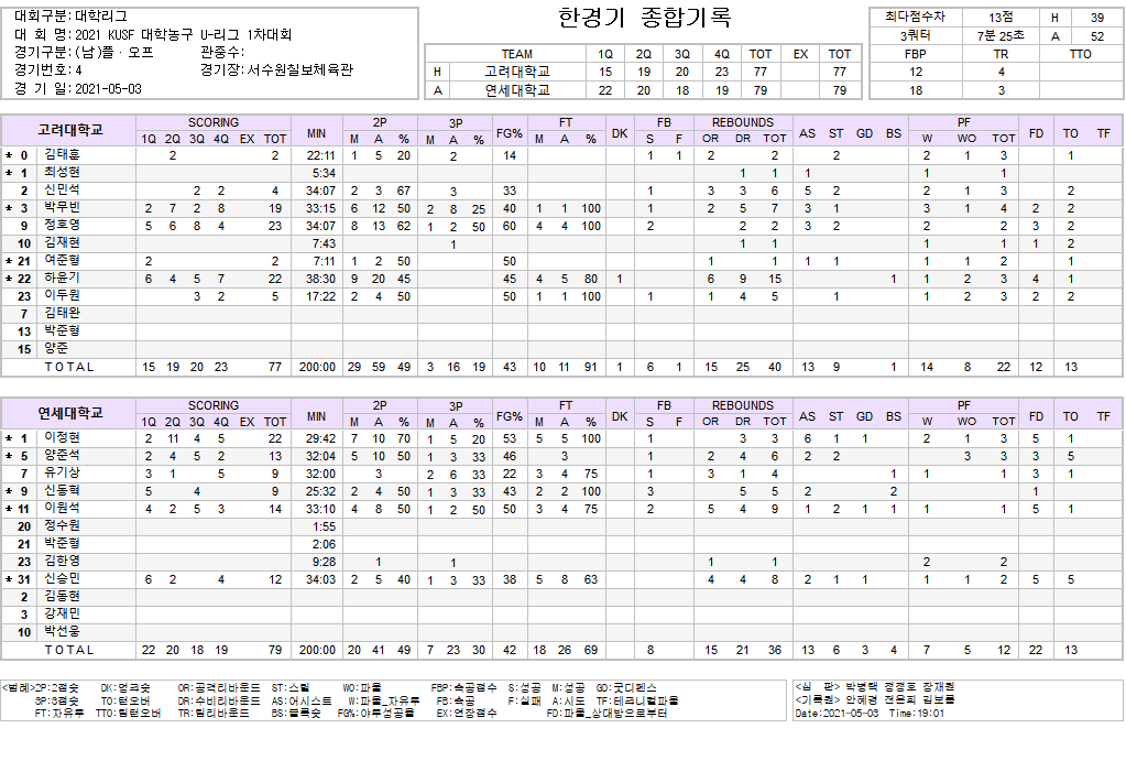 2021.05.07 - [농구 이야기] - [대학리그] 2021.4.30. 고려대 vs 경희대 (91:78 승) 기록지 및 다시 보기