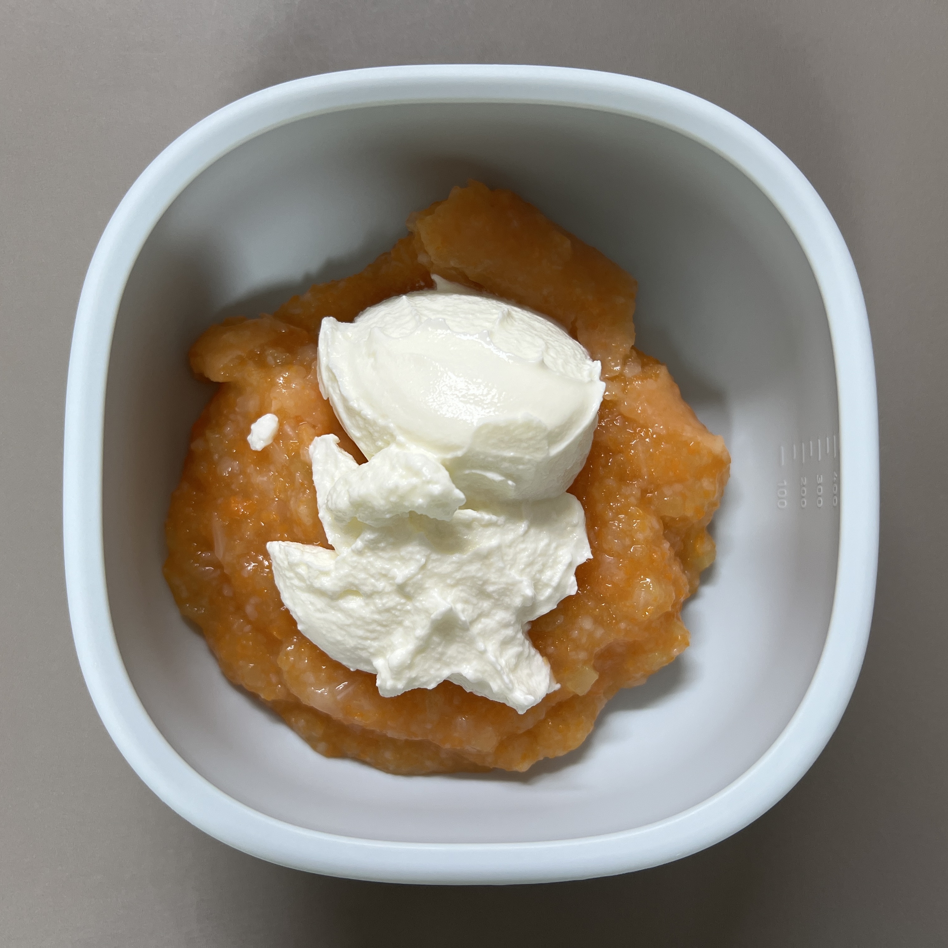 * 아침 식사: 당근 요거트 스프 180g + 산골 사과배 퓨레 50g. 얇게 썬 사과 두 쪽 + 달걀흰자 반 개.