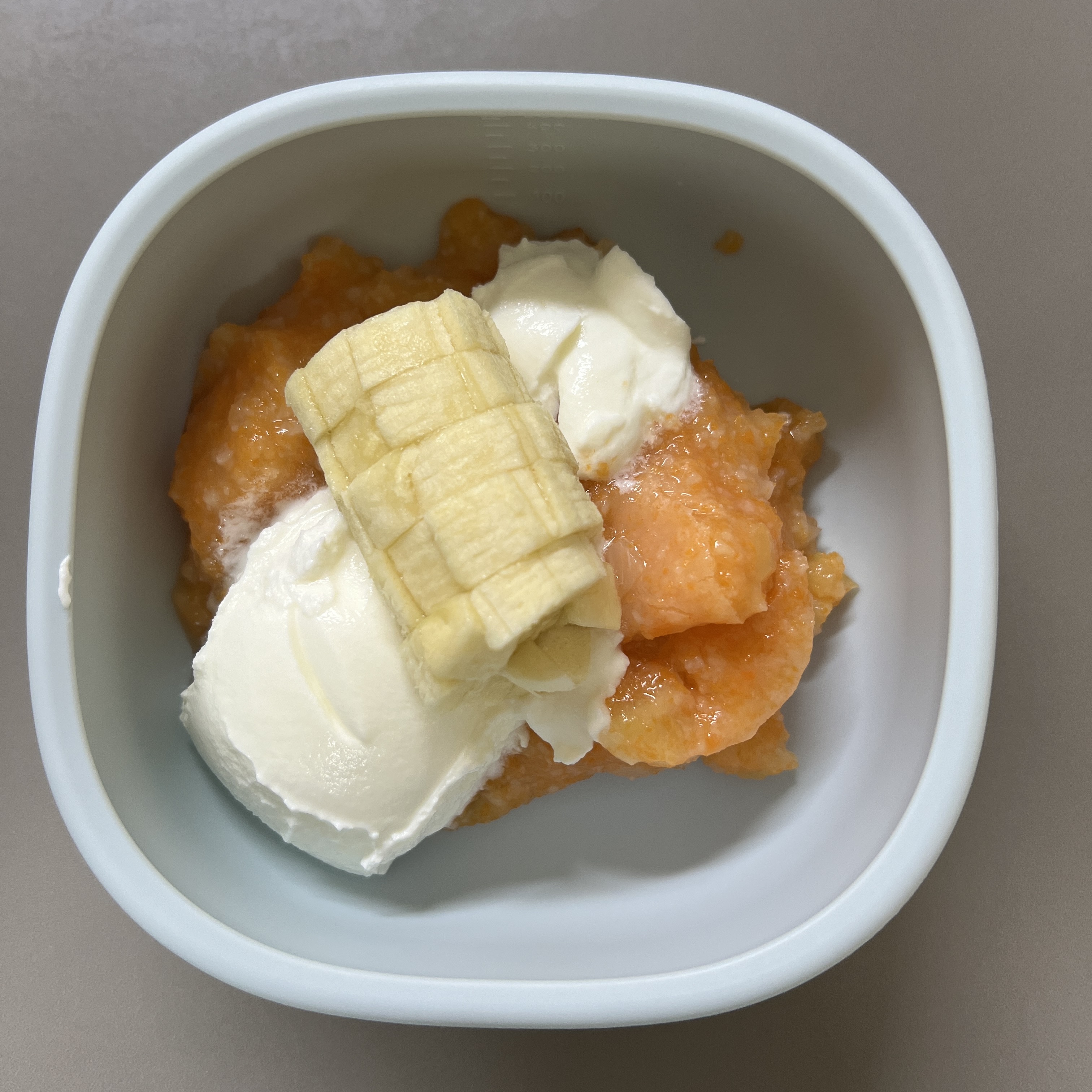 어제 사과배 퓨레를 넣어 먹인 당근 요거트 스프. 오늘은 처음부터 바나나를 잘게 썰어 넣어주었다. 봄이도 만족스러운 듯 금방 다 먹었다.